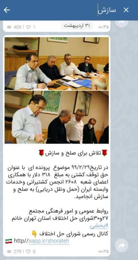 به گزارش پایگاه خبری سی نیوز، در این جلسه، پرونده ای با عنوان حق توقف کشتی به مبلغ 318 دلار با همکاری اعضای شعبه 2608 انجمن کشتیرانی و خدمات وابسته ایران (حمل ونقل دریایی) به صلح و سازش انجامید.