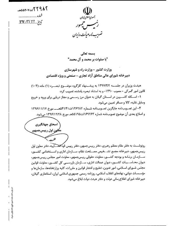 بر اساس این گزارش، هیات وزیران در جلسه بیست و دوم خرداد امسال به پیشنهاد کارگروه ذیربط در کمیسیون امور زیربنایی دولت، تبصره یک ماده ۱۰۳ امور گمرکی مصوب سال ۱۳۹۰ مجلس را بررسی کرد و شناخته شدن بندر کاسپین را به عنوان مرز رسمی به تصویب رساند.