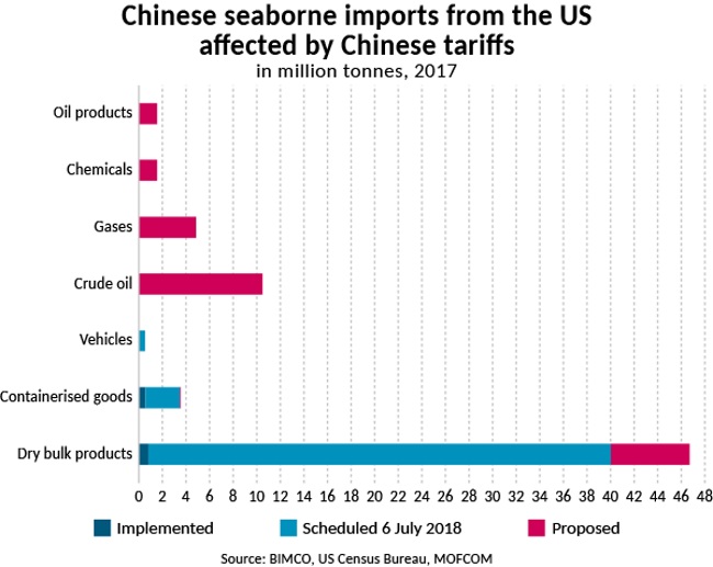 صنعت حمل ونقل فله خشک از لحاظ حجم بخش قابل توجهی از تعرفه چینی ها را به خود اختصاص می دهد. به عنوان مثال، حمل سویا از آمریکا به چین بیشترین حجم را به میزان 32 میلیون تن در سال 2017 به خود اختصاص داد. در ماه آینده مشخص می شود که جایگزینی کشوری مانند برزیل برای تامین سویا چین تا چه اندازه مثبت خواهد بود. در ماه می، برزیل توانست بیش از 12 میلیون تن سویا از راه دریا به چین صادر کند که در نوع خودش یک رکورد محسوب می شود. اما هنوز مشخص نیست که بتواند کاملا جایگزین مناسبی برای واردات از آمریکا باشد.