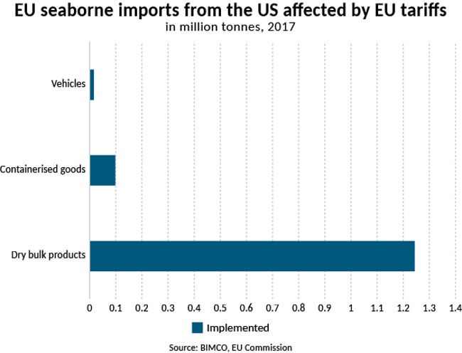 اتحادیه اروپا تعرفه مقابله با دلار آمریکا را به مبلغ 4.3 میلیارد دلار وضع کرد تا پاسخی به وضع تعرفه های ایالات متحده بدهد. این تعرفه ها از روز 22 ژوئن به اجرا درآمد و طیف وسیعی از صادرات آمریکا شامل غلات، محصولات فلزی، برخی نوشیدنی ها و موتورسیکلت ها را شامل شد. این فهرست شامل کالاهایی بود که در سال 2017 میلادی مجموعه ای از تجارت به وزن 1.35 میلیون تن را به خود اختصاص می داد. همچنین در سال گذشته میلادی، مجموع 1.24 میلیون تن از کالاهای فله ای از آمریکا به اتحادیه اروپا صادر شد. محصولات کشاورزی بخش عمده این صادرات یعنی چیزی حدود 1 میلیون تن را به خود اختصاص داد. از مجموع این یک میلیون تن نیز 9.5 درصد آن به ذرت، فولاد و آلومینیوم رسید.