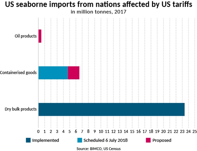 در دوره اول، تنها کالاهای فله ای مورد هدف تعرفه ها هستند. آمریکا در سال 2017 از طریق دریا 18.8 میلیون تن فولاد و 4.4 میلیون تن آلومینیوم را وارد کرد. جالب اینکه مجموع واردات فولاد و آلومینیوم آمریکا، حدود نیم درصد کل تجارت دریایی فله خشک در سال 2017 بوده است. تعرفه 50 میلیارد دلاری آمریکا بر روی واردات از چین بر روی خطوط کشتیرانی شرقی تاثیر منفی می گذارد. در فهرست اول، روی 4.7 میلیون تن کالا که به صورت کانتینری از چین به مقصد آمریکا فرستاده می شود تاثیر دارد که چیزی حدود 470 هزار TEU کانتینر می شود. ( با احتساب وزنی 10 تن برای هر کانتینر )