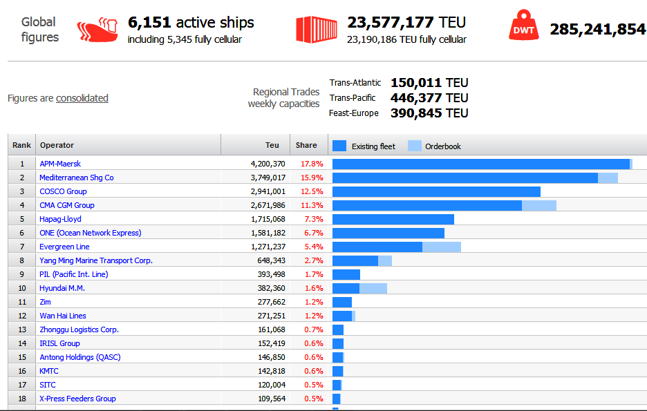 به گزارش پایگاه خبری سی نیوز، رنکینگ برترین شرکت های فعال در عرصه حمل ونقل کانتینری جهان نسبت به ماه گذشته همچنان بی تغییر باقی مانده و ای.پی.ام مرسک با اختصاص سهم 17.8 درصدی کل حمل ونقل کانتینری دنیا در رتبه یک قرار دارد. شرکت های مدیترانه ای، کاسکو، سی.ام.ای سی.جی.ام و هاپاگ لوید در رتبه های بعدی این فهرست قرار دارند.