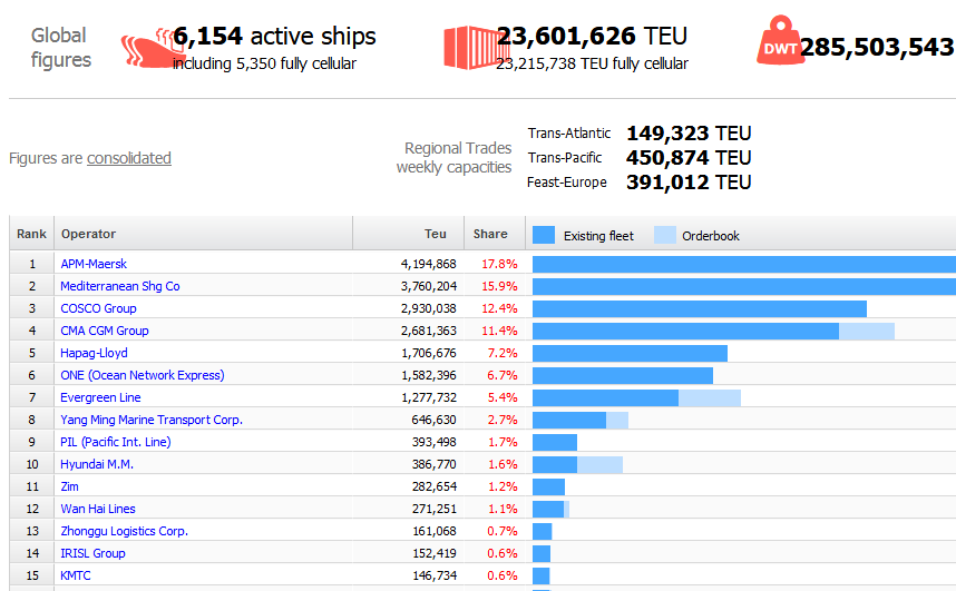 ای. پی. ام. مرسک در تمام ماه های سال 2019 توانست صدرنشینی خود را حفظ کند و به آن تداوم بخشد. مرسک هم اکنون با اختصاص 17.8 درصد از کل حمل ونقل کانتینری جهان با اختلاف قابل توجه نسبت به رتبه دوم، بدون تهدید در صدر جدول باقی مانده است.