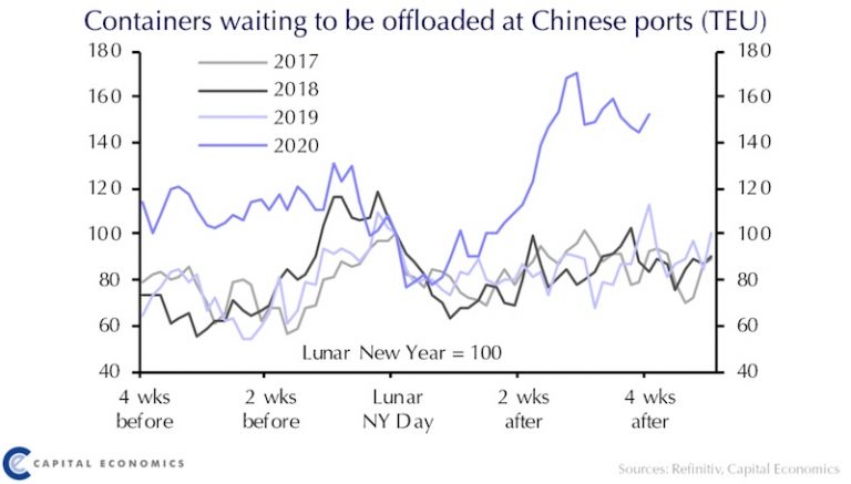 به گزارش پایگاه خبری سی نیوز، شیوع ویروس کرونا از یک سو و آغاز سال نو چینی از سوی دیگر باعث افت شدید فعالیت های بندری چین شد. این دو موضوع باعث شده بود که شاخص تولید این کشور در ماه فوریه نیز به پایین ترین حدممکن برسد و در بدترین وضعیت قرار بگیرد.
