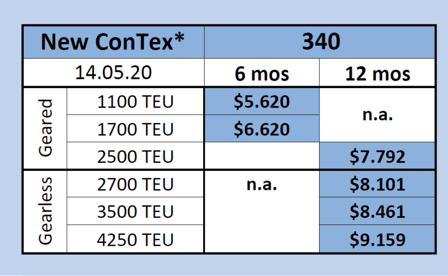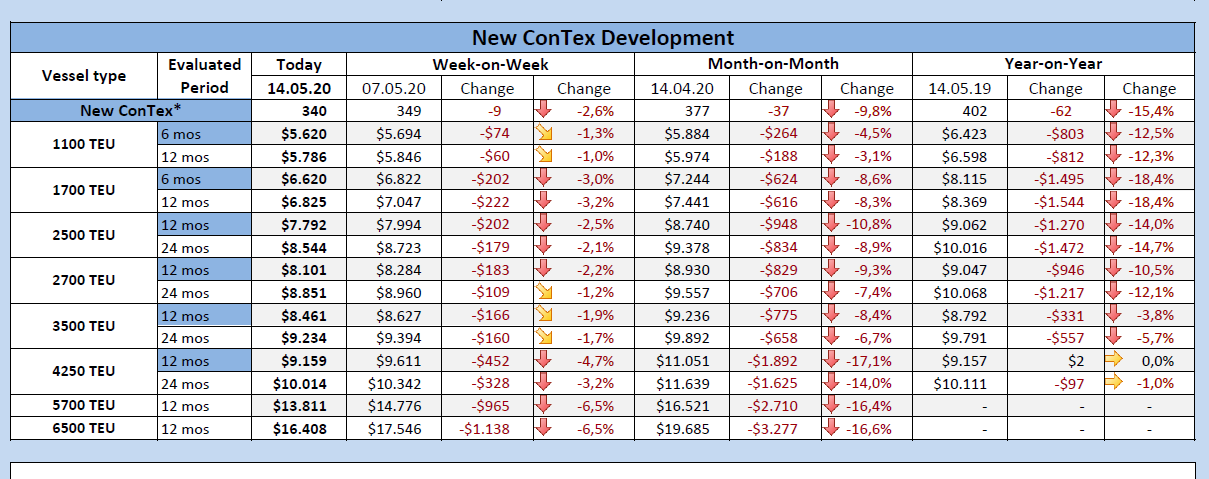 شاخص اجاره بهای کشتی های کانتینری در روزهای پایانی ماه می نیز به کاهش خود ادامه داد. در حال حاضر شاخص اجاره بهای کشتی های کانتینری روی امتیاز 340 باقی مانده، در حالی که این شاخص در ماه گذشته میلادی عدد 355 را نشان می داد.
