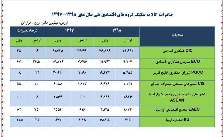 این گزارش می‌افزاید: میزان صادرات ایران از نظر ارزشی به کشورهای سازمان همکاری‌ اسلامی در سال 98 در مجموع 24 میلیارد و 661 میلیون دلار و به کشورهای عضو سازمان‌ همکاری‌‌های اقتصادی 9 میلیارد و 707 میلیون دلار و به کشورهای عضو شورای همکاری خلیج فارس 5 میلیارد و 455 میلیون دلار و به کشورهای مستقل مشترک المنافع 2 میلیارد و 231 میلیون دلار بوده است.