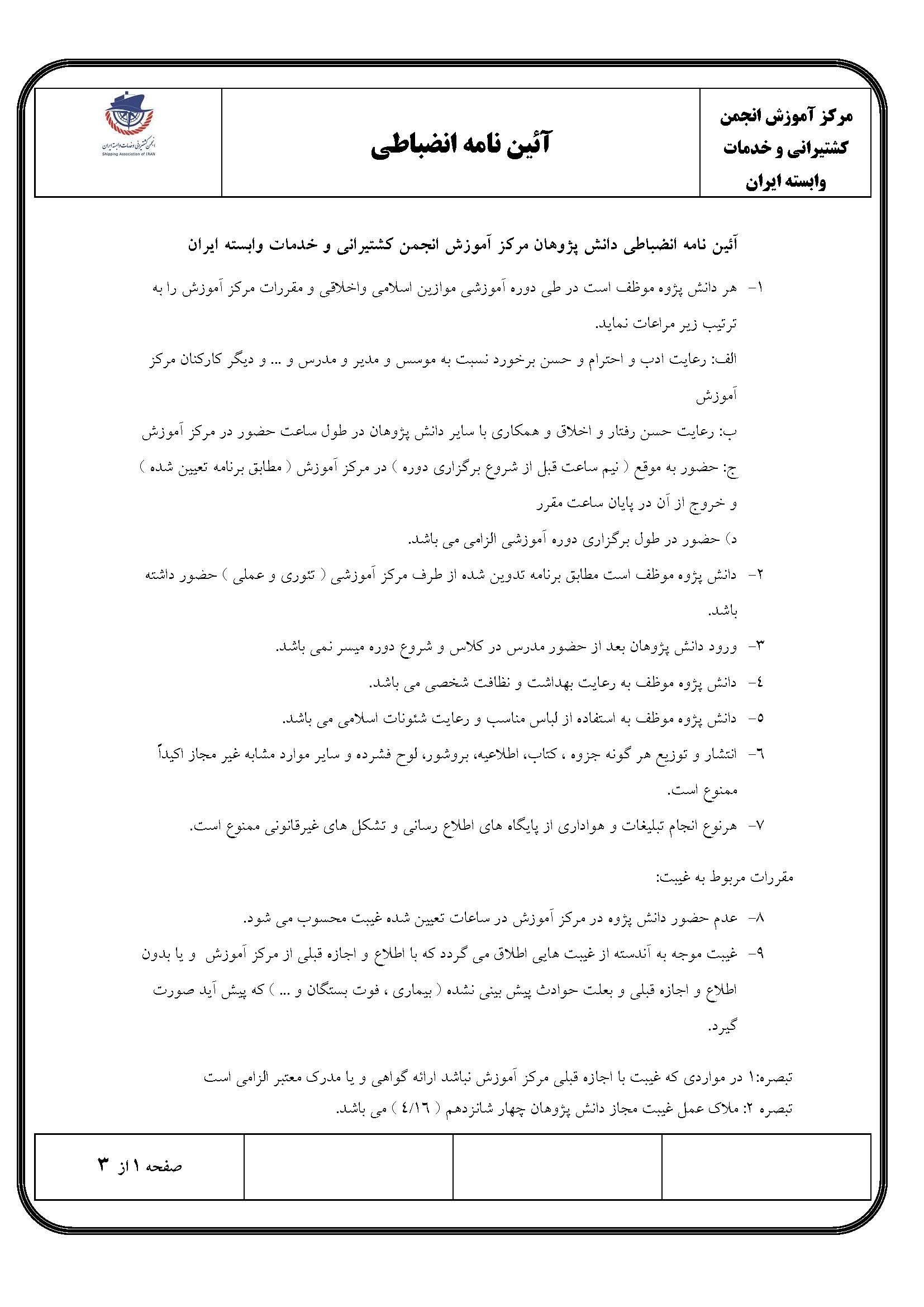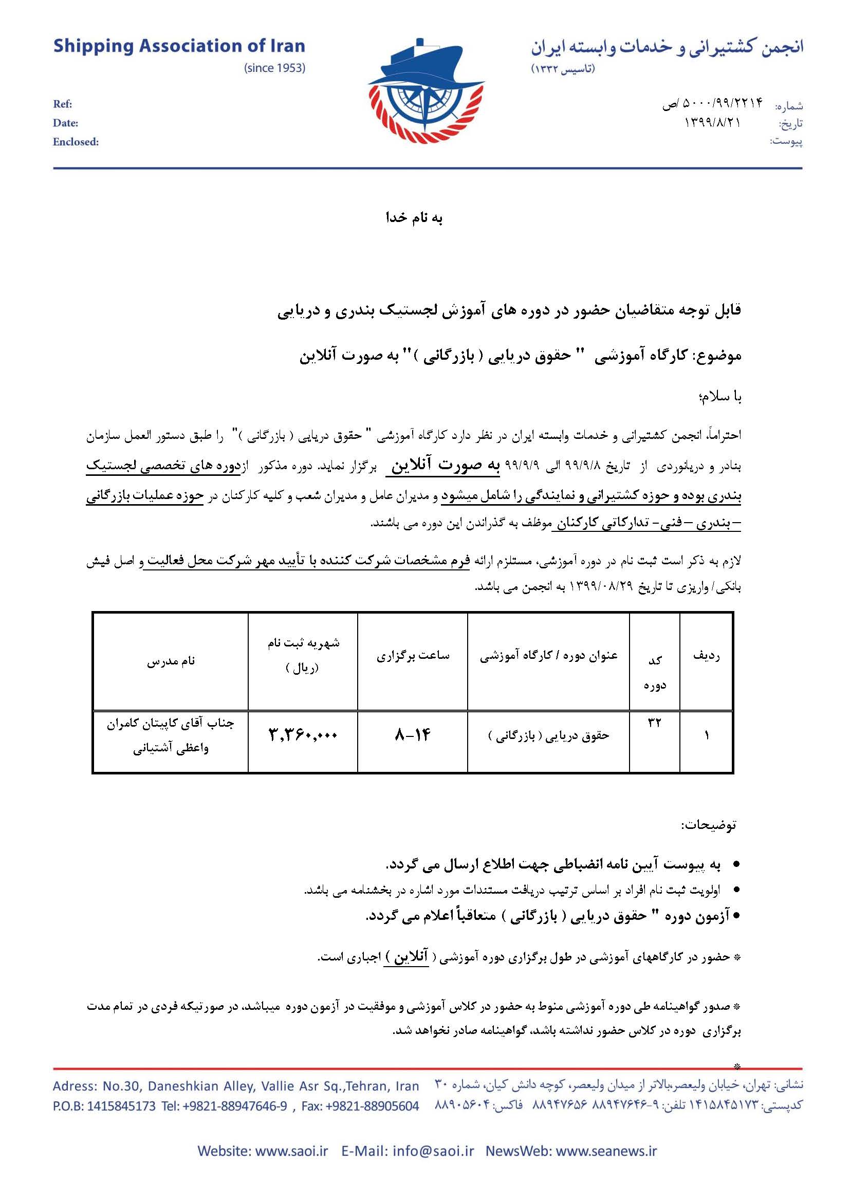 احتراماً، انجمن کشتیرانی و خدمات وابسته ایران در نظر دارد کارگاه آموزشی ” حقوق دریایی (بازرگانی)” را طبق دستور العمل سازمان