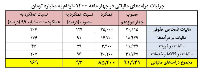 مجموع درآمدهای مالیاتی مصوب طبق قانون بودجه برای چهار ماهه اول سال جاری 91 هزار و 941 میلیارد تومان بوده که حدود 93 درصد این رقم تحقق پیدا کرده است.