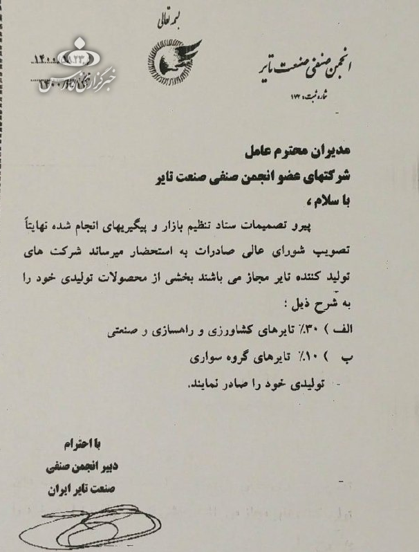 در نامه انجمن صنعت تایر آمده است: این تصمیم با تصویب شورای عالی صادرات گرفته شده است.