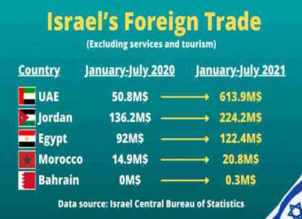 از زمان امضای توافق عادیسازی روابط میان رژیم صهیونیستی و برخی کشورهای عربی، حجم مبادلات تجاری میان تلآویو و این کشورها به چند برابر رسیده است.