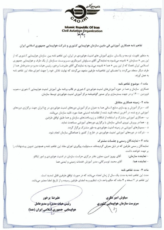 تفاهم‌نامه همکاری بین هواپیمایی جمهوری اسلامی ایران و سازمان هواپیمایی با محوریت «برنامه ملی آموزش امنیت هوانوردی» به امضا رسید.