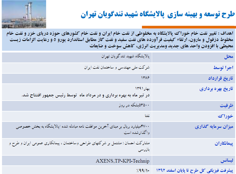 - پیگیری پروژههای ارتقای کمی و کیفی پالایشگاه تهران برای افزایش کیفیت بنزین تولیدی به استاندارد یورو