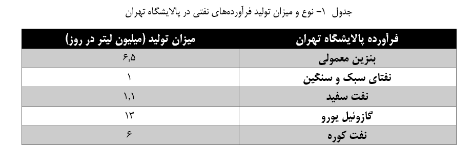 جدول 1- نوع و میزان تولید فرآوردههای نفتی در پالایشگاه تهران