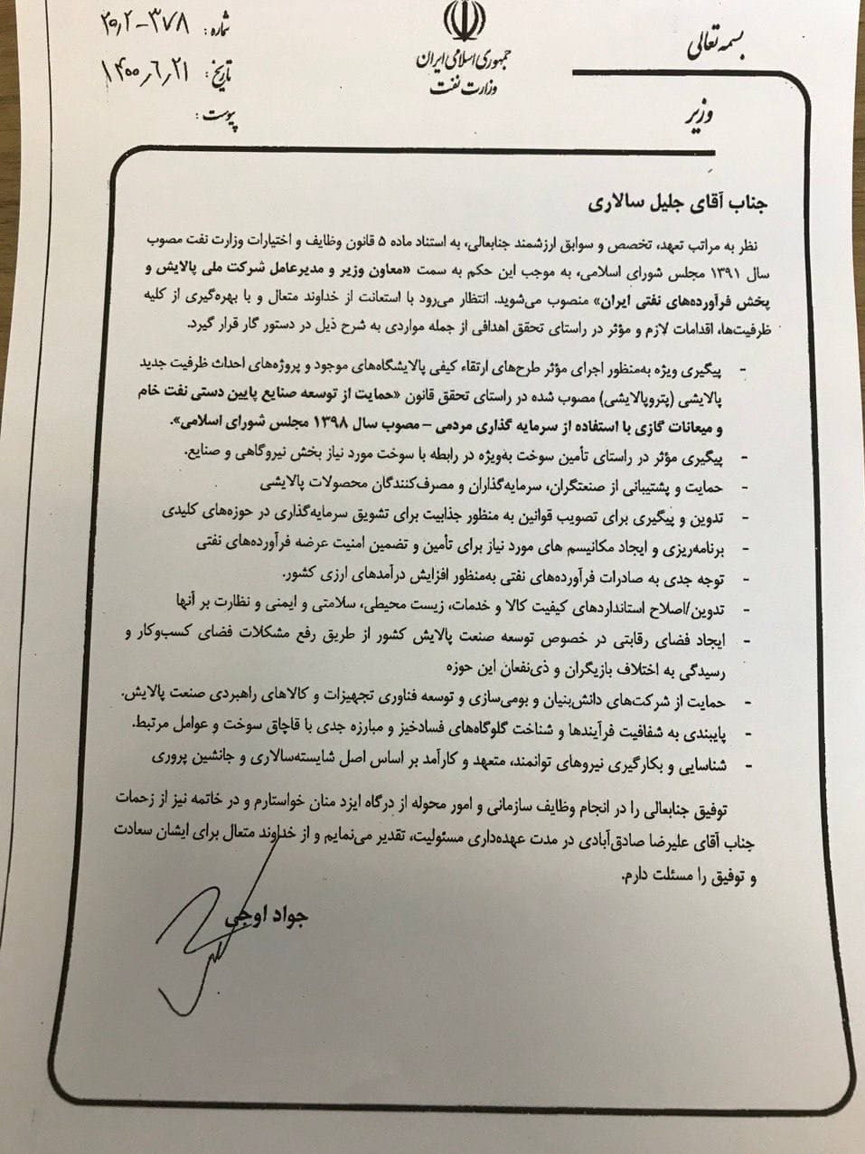 با حکم جواد اوجی وزیر نفت،جلیل سالاری به سمت معاون وزیر و مدیر عامل شرکت ملی پالایش و پخش فرآوردههای نفتی ایران منصوب شد.