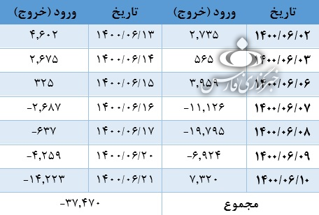 از ابتدای شهریور ماه سال 1400 در 14 روز کاری، بازار سرمایه در 7 روز ورود پول حقیقی را شاهد بوده است. اما در 7 روز دیگر خروج پول حقیقی از بازار سرمایه رخ داده است. در مجموع از ابتدای شهریور تا کنون 3 هزار 740 میلیارد تومان پول از بازار سرمایه خارج شده است.