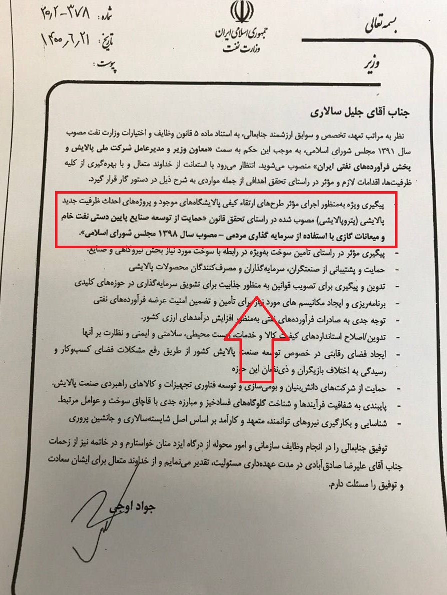 نکته جالب توجه درباره انتصاب سالاری به مدیرعاملی شرکت ملی پالایش و پخش، ماموریتهایی است که جواد اوجی وزیر نفت در نامه انتصاب به وی تکلیف کرده است. در این نامه مهمترین ماموریت مدیرعامل جدید شرکت ملی پالایش و پخش «پیگیری ویژه به منظور اجرای موثر طرحهای ارتقاء کیفی پالایشگاههای موجود و پروژههای احداث ظرفیت جدید پالایشی (پتروپالایشی) مصوب شده در راستای تحقق قانون حمایت از توسعه صنایع پاییندستی نفت خام و میعانات گازی با استفاده از سرمایهگذاری مردمی (مصوب سال 1398 مجلس شورای اسلامی)» تعریف شده است (تصویر 5).
