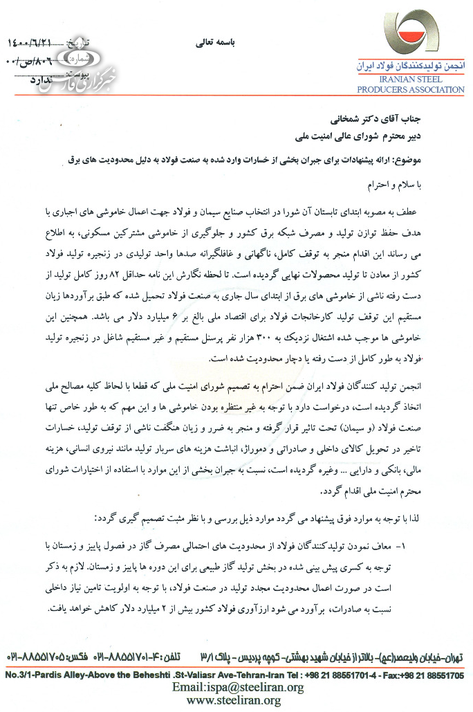 در این نامه آمده است: تا لحظه نگارش این نامه، خاموشیهای برق باعث از دست رفتن حداقل ۸۲ روز کامل تولید صنعت فولاد از ابتدای سال جاری شده که زیان مستقیم ناشی از این توقف تولید برای اقتصاد ملی بالغ بر ۶ میلیارد دلار است و ۳۰۰ هزار شغل مستقیم و غیرمستقیم به طور کامل از دست رفته یا محدود شده است.