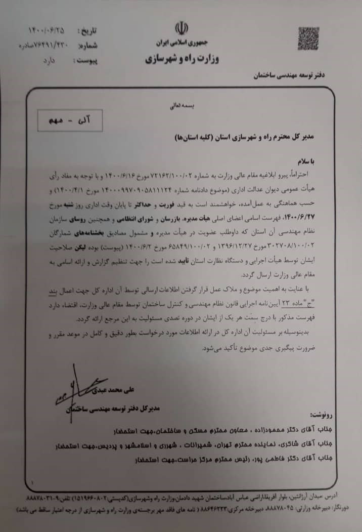 « احتراما پیرو ابلاغیه مقام عالی وزارت به شماره 72162/100/02 مورخ 1400/6/16 و با توجه به مفاد رای هیئت عمومی دیوان عدالت اداری موضوع دادنامه شماره 140009970905811124 مورخ 1400/4/1 و حسب هماهنگی بهعمل آمده خواهشمند است به قد فوریت و حداکثر تا پایان وقت اداری روز شنبه مورخ1400/6/27 فهرست اسامی اعضای اصلی هیئت مدیره، بازرسان و شورای انتظامی و همچنین روسای سازمان نظام مهندسی آن استان که داوطلب عضویت در هیئت مدیره و مشمول مصادیق بخشنامههای شمارگان 302708/100/02 و 65849/100/02 مورخ 1400/6/2 بوده لیکن صلاحیت ایشان توسط هیئت اجرایی و دستگاه نظارت استان تایید شده است را جهت تنظیم گزارش و ارائه اسامی به مقام عالی وزارت ارسال گردد.
