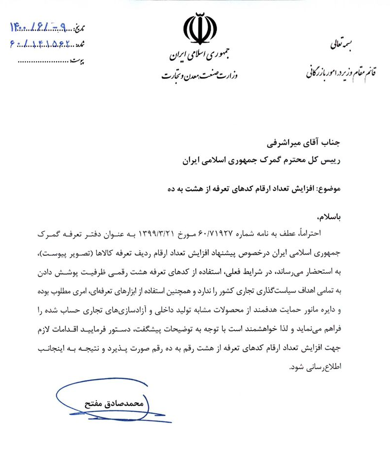 وی در نامهای به میراشرفی رئیس کل گمرک نوشت: عطف به نامه شماره ۶۰/۷۱۹۲۷ مورخ ۱۳۹۹/۳/۲۱ به عنوان دفتر تعرفه گمرک جمهوری اسلامی ایران در خصوص پیشنهاد افزایش تعداد ارقام ردیف تعرفه کالاها (تصویر پیوست)، به استحضار میرساند، در شرایط فعلی، استفاده از کدهای تعرفه هشت رقمی ظرفیت پوشش دادن به تمامی اهداف سیاست گذاری تجاری کشور را ندارد و همچنین استفاده از ابزارهای تعرفهای، امری مطلوب بوده و دایره مانور حمایت هدفمند از محصولات مشابه تولید داخلی و آزادسازی های تجاری حساب شده را فراهم مینماید و لذا خواهشمند است با توجه به توضیحات پیشگفت، دستور فرمایید اقدامات لازم جهت افزایش تعداد ارقام کدهای تعرفه از هشت رقم به ده رقم صورت پذیرد و نتیجه به اینجانب اطلاع رسانی شود.