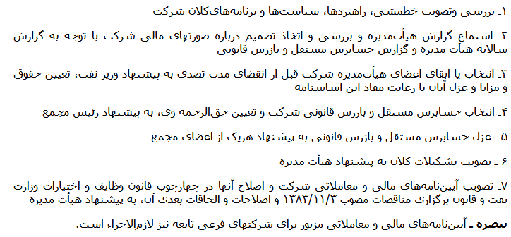 اعضای منصوبشده در هیئتمدیره شرکت ملی نفت، صرفاً در جایگاه حقوقی «عضو هیئتمدیره» موظفاً فعالیت نموده و پست سازمانی دیگری را در شرکت در اختیار نداشته باشند.