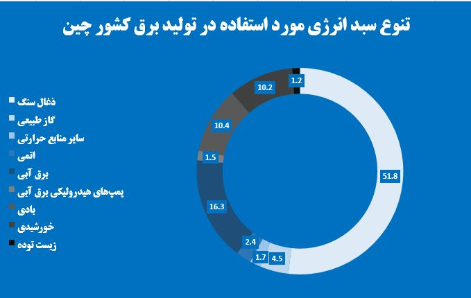 بر این اساس بررسی سبد حاملهای انرژی به منظور تولید برق کشورهای مختلف را به کشور چین آغاز میکنیم. در این خصوص 51.8 درصد از ظرفیت اسمی نصب شده 2 میلیون مگاواتی چین با استفاده از ذغالسنگ تامین میشود، 16.3 درصد از سبد انرژی مورد نیاز تولید برق چین از نیروگاههای برقآبی مستقر در سدهای این کشور تامین میشود. نیروگاههای بادی و نیروگاههای خورشیدی به ترتیب 10.4 درصد و 10.2 درصد در تولید برق نقش دارند. 4.5 درصد از تولید برق چینیها از گاز طبیعی تامین شده و 1.7 درصد نیز از انرژی اتمی استحصال میشود. 2.7 درصد ظرفیت نصب شده نیروگاهی باقیمانده نیز از منابع زیست توده و همچنین پمپهای هیدرولیکی تامین میشود.