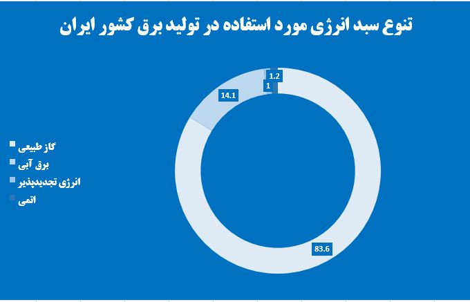 با توجه به موارد ذکر شده نگاهی به سبد تولید برق کشور بیانگر تنوع نامناسب حاملهای انرژی مورد استفاده است. در این راستا، 83.6 درصد از نیروگاههای کشور وابسته به گاز طبیعی است، 14.1 درصد برق کشور نیز در نیروگاههای برقآبی تامین میشود. از سوی دیگر مجموع تامین برق از انرژیهای تجدیدپذیر کمتر از 1 درصد ظرفیت نصب شده تولید برق را شامل شده و 1 نیروگاه اتمی بوشهر نیز مسئولیت تامین 1.2 درصد از برق کشور را بر عهده دارد.