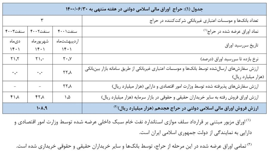 در هجدهمین حراجی سال 1400 بالغ بر 10 هزار و 890 میلیارد تومان از اوراق دولت به فروش رسیده است.