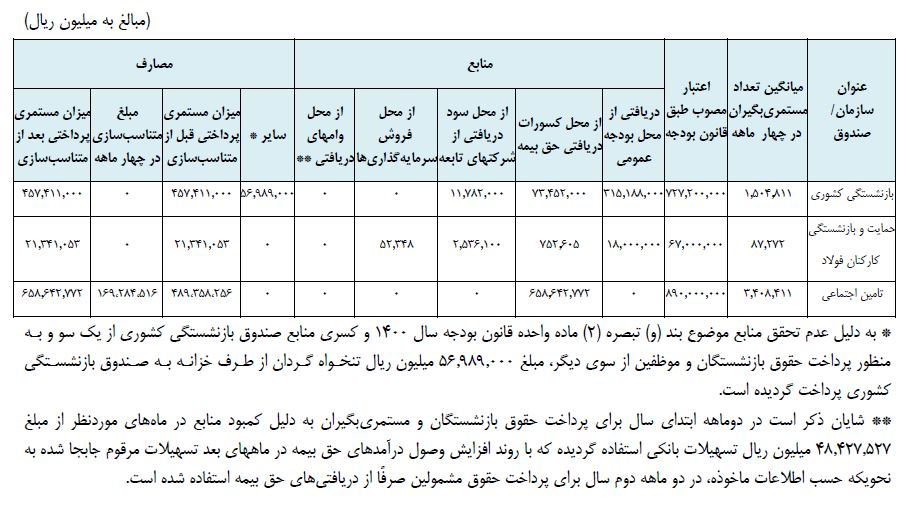شایان ذکر است در دوماهه ابتدای سال برای پرداخت حقوق بازنشستگان و مستمری بگیران به دلیل کمبود منابع در ماه‌های مورد نظر از مبلغ 48.427.527 میلیون ریال تسهیلات بانکی استفاده گردیده که با روند افزایش وصول درآمدهای حق بیمه در ماه‌های بعد، برای پرداخت حقوق مشمولین در دو ماهه دوم سال 1400 ، از دریافتی‌های حق بیمه استفاده شده است. در خصوص منابع بودجه‌ای صندوق بازنشستگی کارکنان فولاد، در سال 1400 مبلغ 55.000.000 میلیون ریال جهت پرداخت مستمری ذیل جدول شماره (9) بودجه کل کشور و مبلغ 12.000.000 میلیون ریال جهت همسان‌سازی و متناسب‌سازی بازنشستگان از محل بند (و) تبصره (2) قانون بودجه سال 1400 پیش‌بینی شده است.