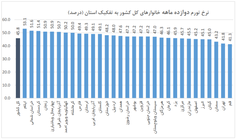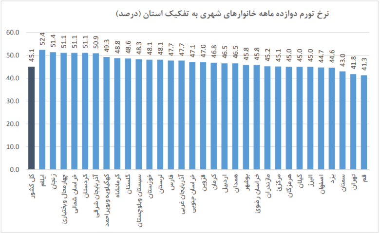 بیشترین نرخ تورم دوازده ماهه مربوط به استان ایلام با ۵٢.٤ درصد و کمترین آن مربوط به استان قم با ۴١.٣ درصد است.