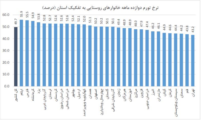 نرخ تورم دوازده ماهه منتهی به شهریور ماه ١۴٠٠ برای خانوارهای روستایی به عدد ۴٩.٧ درصد رسید.