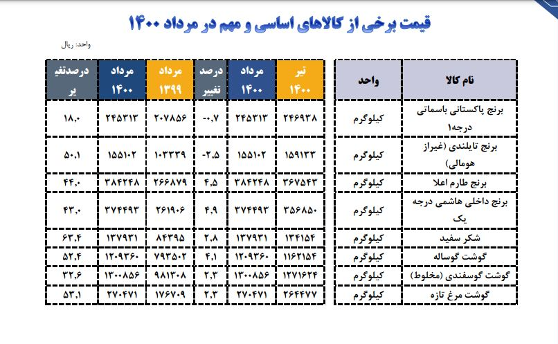 براساس این گزارش هر کیلوگرم برنج پاکستانی باسماتی درجه یک در مرداد ماه 1400 نسبت به مرداد 1399 در مجموع 18 درصد رشد داشته است که براین اساس قیمت هر کیلوگرم آن از 207 هزار و 856 ریال در مرداد 1399 به 245 هزار و 313 ریال در مرداد ماه 1400 رسیده است.