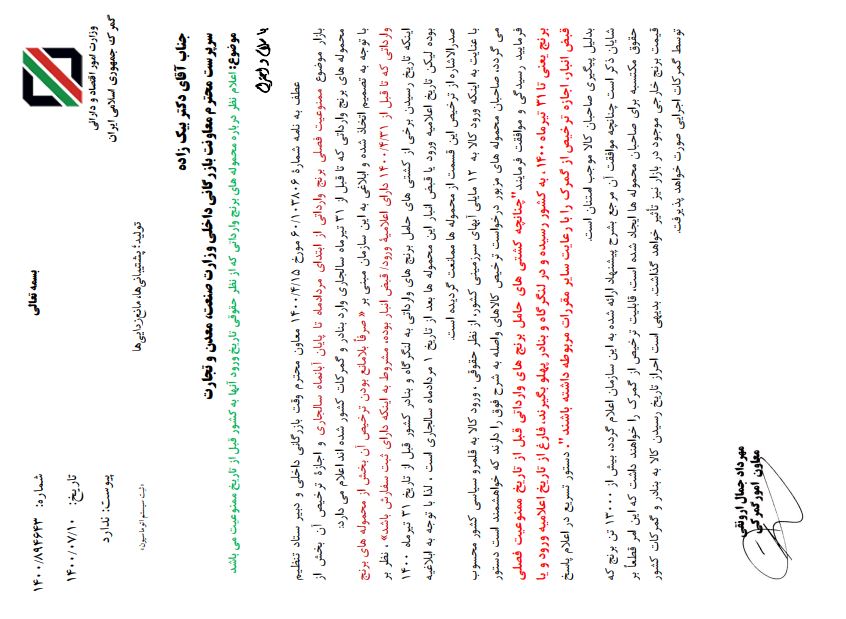 در این مکاتبه آمده است: عطف به نامه شمارۀ ١٠٣٨٠٦/٦٠ مورخ ۱۴۰۰.۴.۱۵ معاون وقت بازرگانی داخلی و دبیر ستاد تنظیم بازار موضوع ممنوعیت فصلی برنج وارداتی از ابتدای مردادماه تا پایان آبانماه سالجاری و اجازۀ ترخیص آن بخش از محمولههای برنج وارداتی که تا قبل از ٣١ تیرماه سالجاری وارد بنادر و گمرکات کشور شده اند اعلام می دارد: با توجه به تصمیم اتخاذ شده و ابلاغی به این سازمان مبنی بر «صرفاً بلامانع بودن ترخیص آن بخش از محموله های برنج وارداتی که تا قبل از ۱۴۰۰.۴.۳۱ دارای اعلامیۀ ورود/ قبض انبار بوده، مشروط به اینکه دارای ثبت سفارش باشد»، نظر بر اینکه تاریخ رسیدن برخی از کشتیهای حامل برنجهای وارداتی به لنگرگاه و بنادر کشور قبل از تاریخ ٣١ تیرماه ١٤٠٠ بوده لیکن تاریخ اعلامیه ورود یا قبض انبار این محمولهها بعد از تاریخ ١ مردادماه سالجاری است ، لذا با توجه به ابلاغیه صدرالاشاره از ترخیص این قسمت از محمولهها ممانعت شده است.