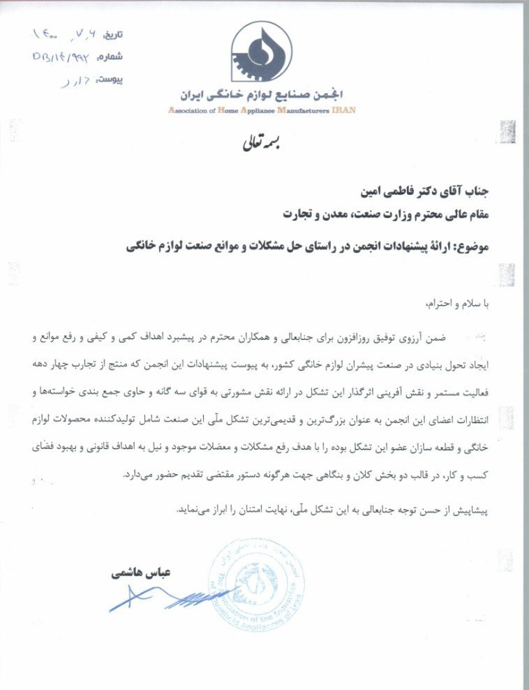 انجمن صنایع لوازم خانگی ایران با ارسال نامه ای به وزیر صمت به ارائه پیشنهاداتی برای حل مشکلات و موانع پیش روی صنعت لوازم خانگی پرداخت.