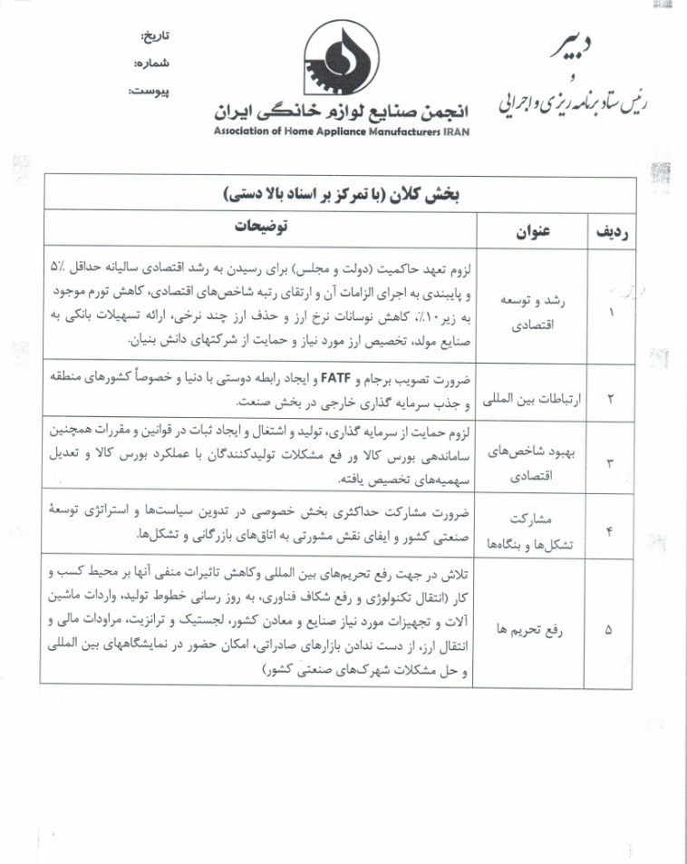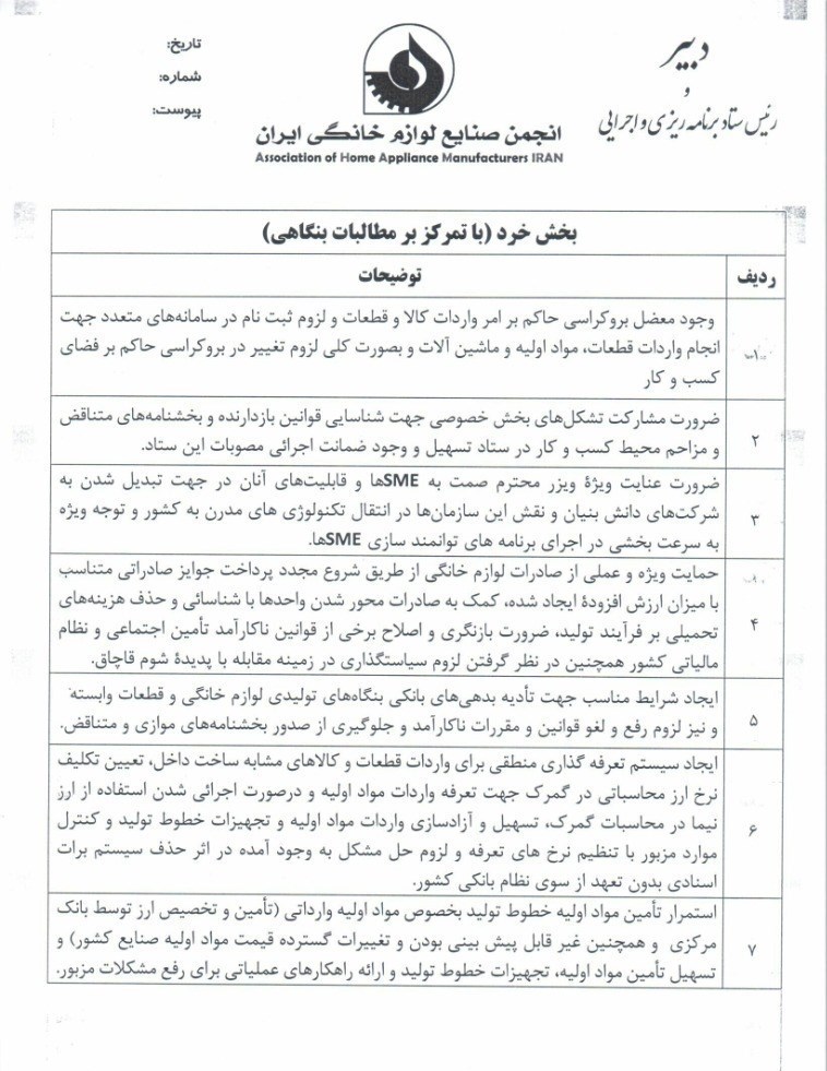 این نامه که به دو بخش تقسیم می شود نخست در بخش خرد مشکلات صنعت لوازم خانگی را در 7 مورد عنوان کرده و سپس در بخش کلان 5 مورد از مشکلات تولیدکنندگان بیان شده است.