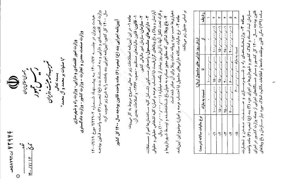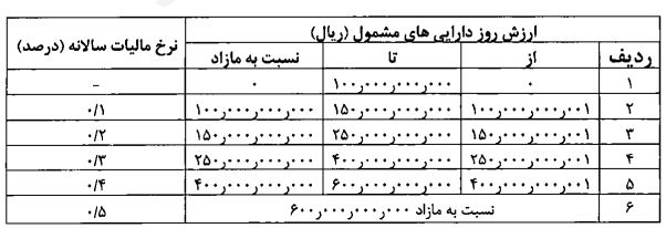 ماده ۲- نرخ مالیات سالانه داراییهای مشمول (با احتساب عرصه و اعیان) موضوع این آیین نامه بر اساس جدول زیر می باشد