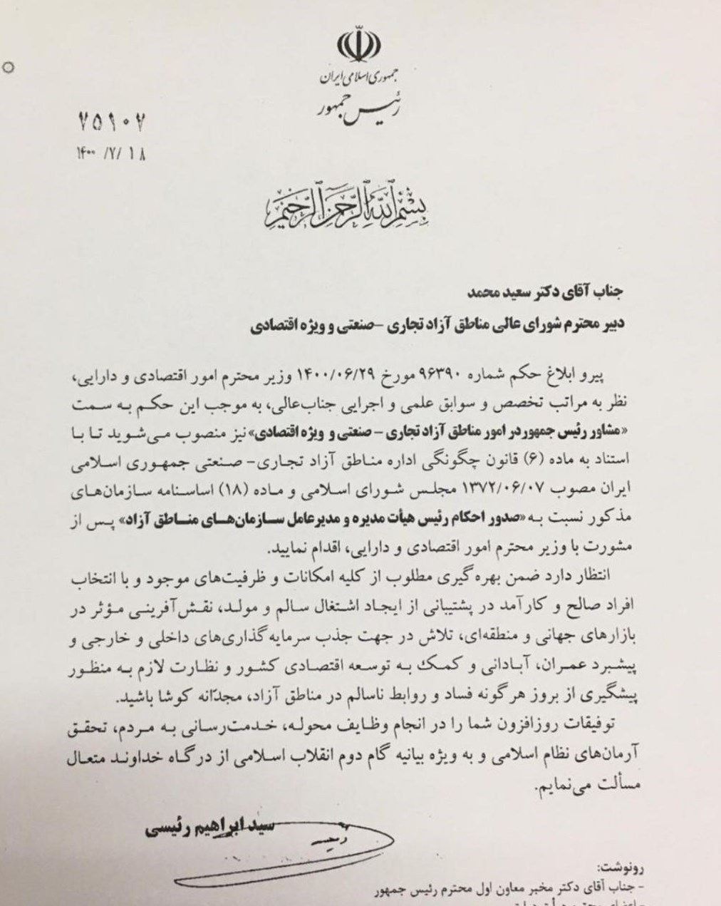 به گزارش سی نیوز به نقل از خبرگزاری تسنیم ، در بخشی از حکم آیت الله رئیسی خطاب به دبیر شورایعالی مناطق آزاد آمده است؛