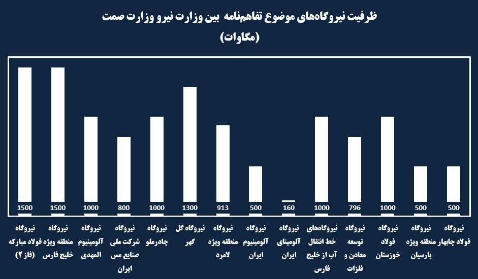 بر اساس جزئیات این تفاهمنامه، سرمایهگذاری ساخت 14 نیروگاه توسط شرکتها فولاد مبارکه اصفهان، فولاد هرمزگان به همراه کاوه جنوب، شرکت آلومینیوم المهدی، شرکت ملی مس، چادرملو، گلگهر، ایمیدرو (منطقه ویژه لامرد-سالکو)، ایرالکو، آلومینای ایران، توسعه آب آسیا، شرکت پویا انرژی، فولاد خوزستان و فولاد سترگ شرق انجام شده و ظرفیت مجموع این 14 نیروگاه برابر 12469 مگاوات برآورد میشود.