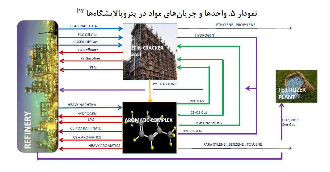 در نمودار زیر جریان‌های مواد تولیدی میان واحدهای پالایشی و پتروشیمیایی (واحد کراکر بخار و آروماتیک‌سازی) در قالب پترو پالایشگاه ارائه شده است.