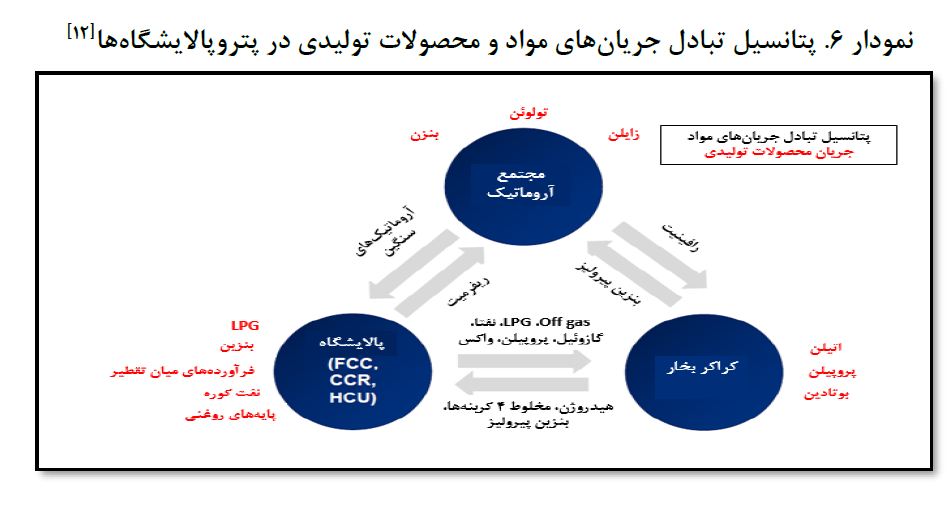 در نمودار زیر به طور خلاصه پتانسیل تبادل جریان‌های مواد و جریان محصولات تولیدی در واحدهای پالایشی و پتروشیمی یکپارچه نشان داده شده است.