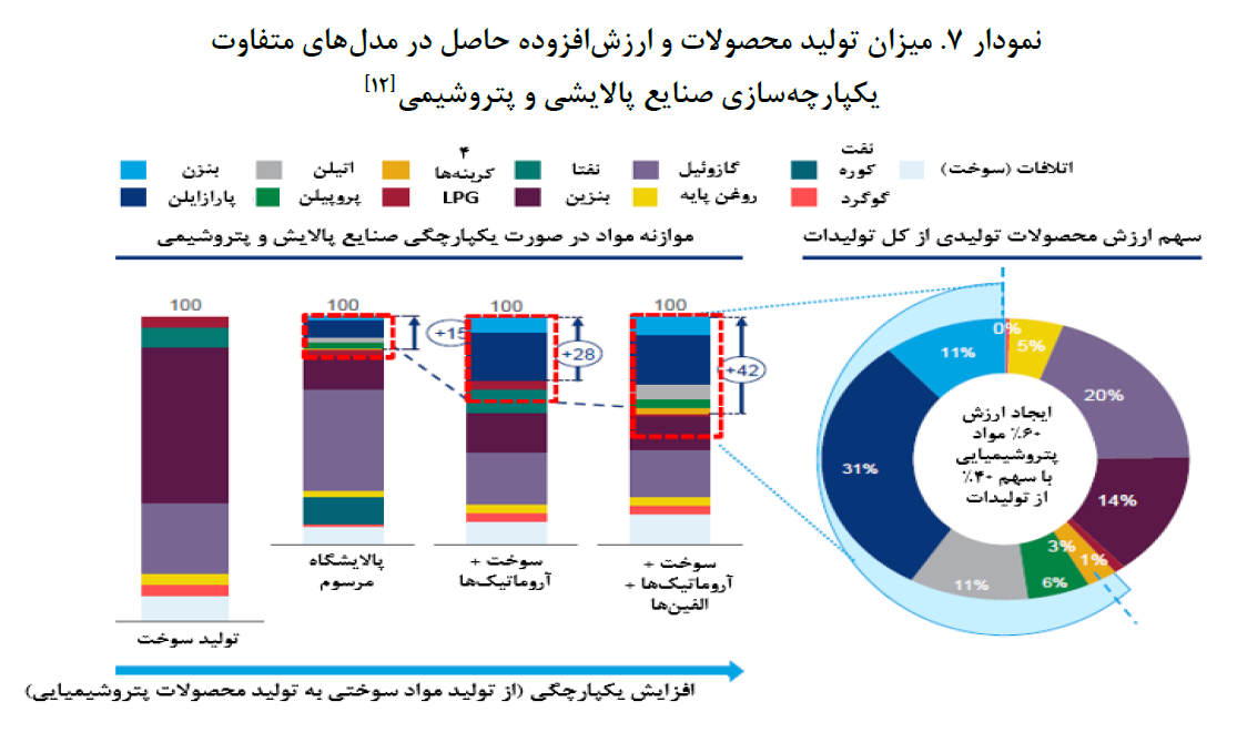 همانطور که در نمودار مشخص است یکپارچگی صنایع پتروشیمی و پالایشی موجب اشتراک جریان مواد در واحدهای مربوط و کاهش اتلاف مواد و تولید محصولات با ارزش افزوده بیشتر نسبت به فراورده‌های حاصل از پالایشگاه‌های مرسوم و قابل استفاده در صنایع پتروشیمی می‌شود.