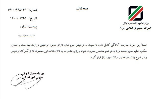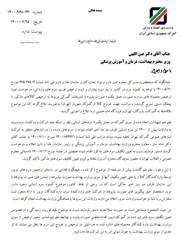 در این نامه معاون فنی گمرک آورده است: همانگونه که مستحضرید مدیرکل محترم امور دارو و مواد تحت کنترل سازمان غذا و دارو طی نامۀ شمارۀ ٢٧٥٠٣/٦٦٥ مورخ ۱۴۰۰.۵.۲۱ با توجه به کمبود سرم در کشور و نیاز مبرم بیماران و لزوم ترخیص فوری سرم های وارداتی، درخواست نمود ترخیص محموله های سرم به صورت حمل یکسره صورت پذیرد و تشریفات گمرکی مربوط به ترخیص کالاهای مذکور با بیجک دستی تسریع گردیده و مراتب، جهت خروج کالا از گمرک شهریار (تهران) به فوریت ابلاغ گردد که این موضوع بلافاصله به گمرکات بازرگان، تهران و فرودگاه امام خمینی (ره) ابلاغ و اجرایی گردید.