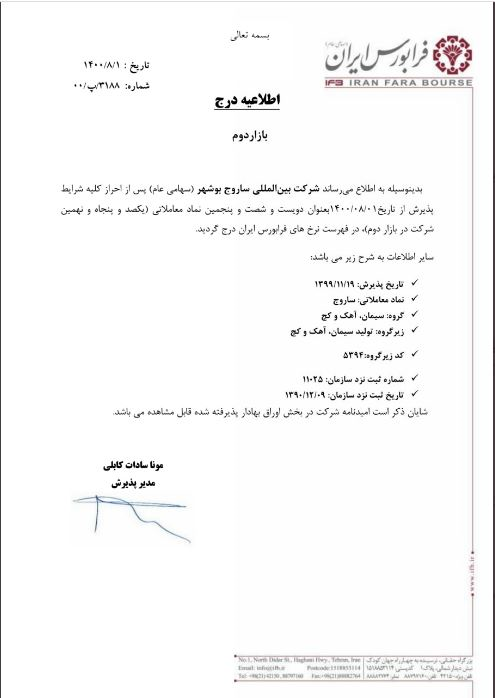 شرکت بینالمللی ساروج بوشهر با ماهیت سهامی عام در بازار دوم فرابورس ایران درج شد.