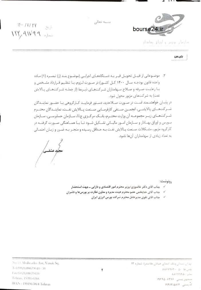 همچنین در این نامه از اوجی خواسته شده که «موضوعاتی از قبیل قیر به دستگاه های اجرایی ( موضوع بند ز) تبصره (1) ماده واحده قانون بودجه سال 1400 کل کشور در صورت لزوم با تنظیم قرارداد مشخص و با رعایت صرفه و صلاح سهامداران شرکت های ذی ربط ا(ز جمله شرکت های پالایش نفت)به شرکت های مزبور محول شود.»