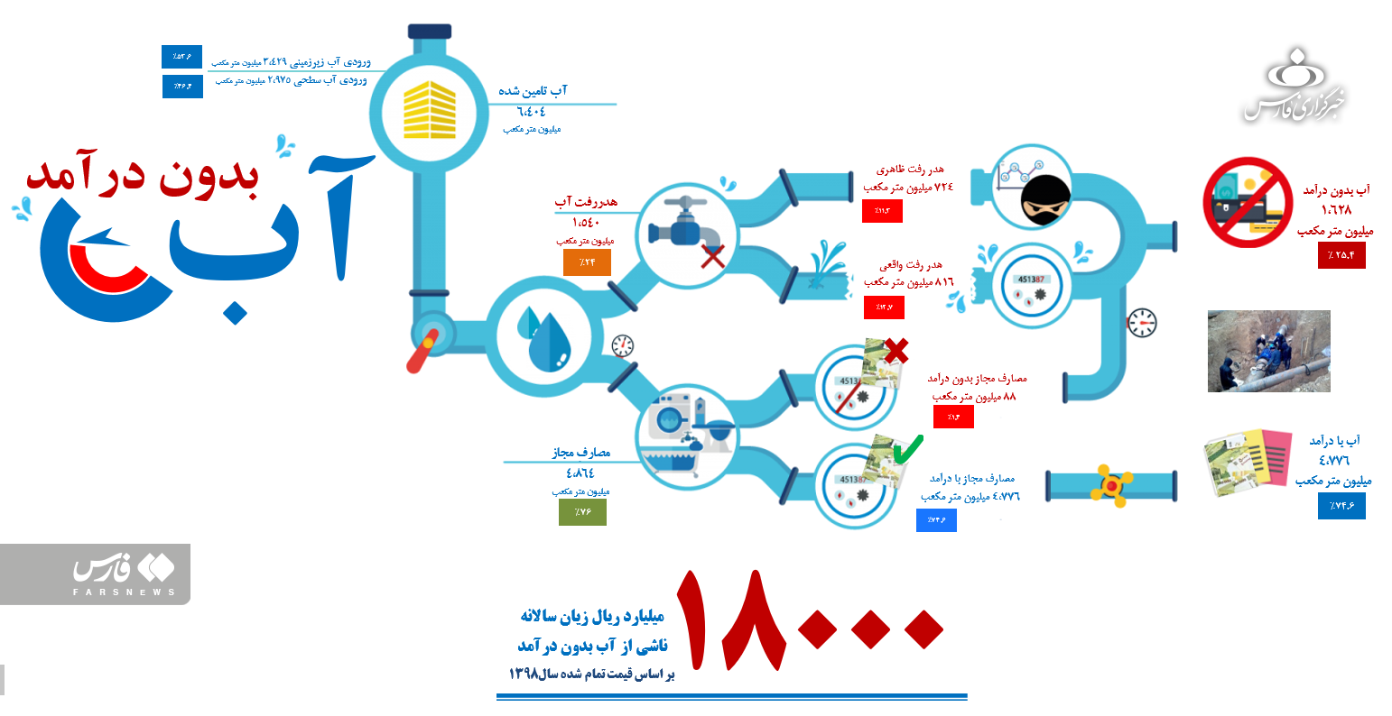 بر همین اساس ضرر سالانه کشور از محل تامین آب بدون درآمد معادل 1800 میلیارد تومان است که در قالب برنامههایی مدون باید نسبت به کاهش آن اقدام کرد. به عبارت دیگر، سالانه یک چهارم از کل آب شرب تامین شده در کشور که با هزینه بسیار زیاد تصفیه میشود، هدر میرود.