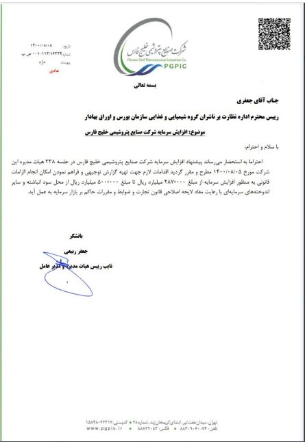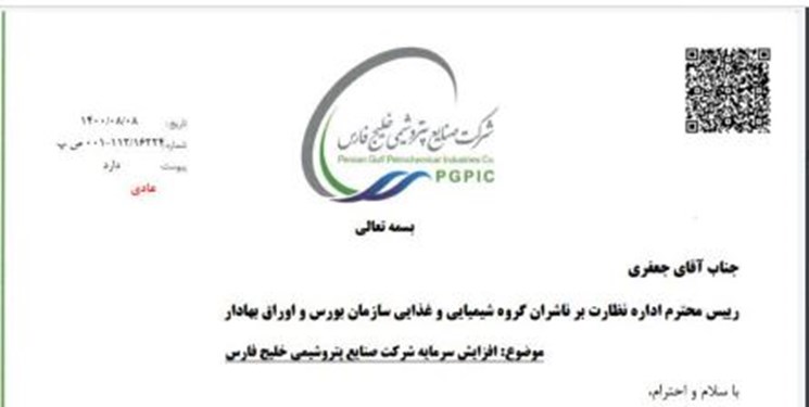 شرکت صنعتی پتروشیمی خلیجفارس در نامهای به رئیس اداره نظارت بر ناشران گروه شیمیایی و غذایی سازمان بورس، اوراق بهادار خبر افزایش سرمایه این شرکت را اعلام کرد.