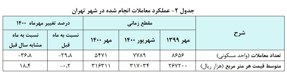 بر مبنای این گزارش، تعداد معاملات آپارتمانهای مسکونی شهر تهران به حدود 5.5 هزار واحد مسکونی رسید که نسبت به ماه قبل و ماه مشابه سال قبل به ترتیب معادل 29.8 و 36.8 درصد کاهش نشان می دهد.