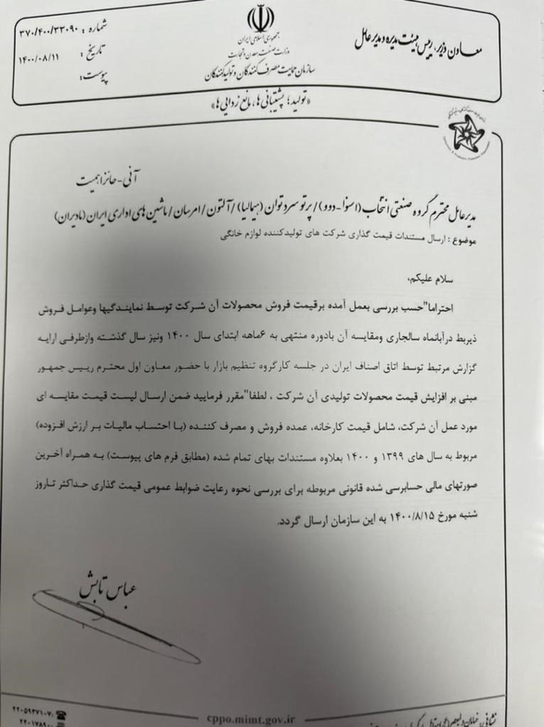 احتراما حسب بررسی بعمل آمده بر قیمت فروش محصولات آن شرکت توسط نمایندگی ها و عوامل فروش ذیربط در آبانماه سالجاری ومقایسه آن با دوره منتهی به 6 ماهه ابتدای سال 1400 و نیز سال گذشته و از طرفی ارائه گزارش مرتبط توسط اتاق اصناف ایران درجلسه کارگروه تنظیم بازار با حضور معاون اول رئیس جمهور مبنی بر افزایش قیمت محصولات تولیدی آن شرکت، لطفا مقرر فرماییدضمن ارسال لیست قیمت مقایسه ای مورد عمل آن شرکت، شامل قیمت کارخانه ، عمده فروش و مصرف کننده ( با احتساب مالیات برارزش افزوده ) مربوط به سال های 1399 و 1400 بعلاوه مستندات بهای تمام شده به همراه آخرین صورتهای مالی حسابرسی شده قانونی مربوطه برای بررسی نحوه رعایت ضوابط عمومی قیمت گذاری حداکثر تا روز شنبه 15 آبان ماه به این سازمان ارسال گردد.