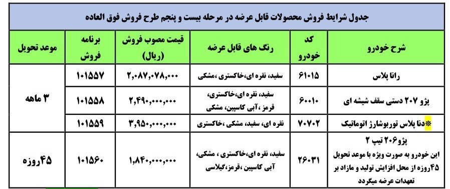 در این طرح که از امروز 19 آبان ماه تا جمعه 21 آبان ماه اجرایی خواهد شد، موعد تحویل رانا پلاس، پژو 207 و دناپلاس سه ماهه و موعد تحویل پژو 206 تیپ دو 45 روزه است.