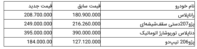 جدول قیمت های جدید محصولات ایران خودرو به شرح زیر است: