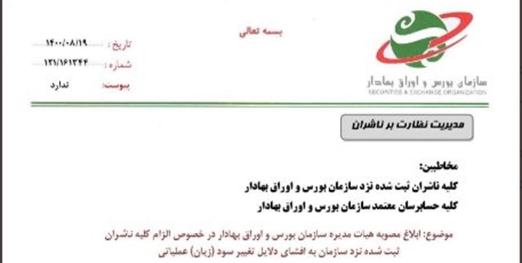 بر اساس نامه محسن انصاری مهیاری مدیر نظارت بر ناشران سازمان بورس، به همه ناشران ثبتشده نزد سازمان بورس و اوراق بهادار و حسابرسان معتمد این سازمان اعلام شد مصوبه هیات مدیره سازمان بورس و اوراق بهادار در مورد الزام کلیه ناشران ثبتشده نزد سازمان به افشای دلایل تغییر سود و زیان عملیاتی ابلاغ میشود.